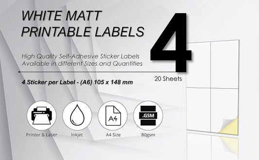 Creavvee A6 Printable White Sticker Paper Labels – 4 Labels per Sheet, 25 A4 Sheets, Compatible with Laser & Inkjet Printers – Made in Europe